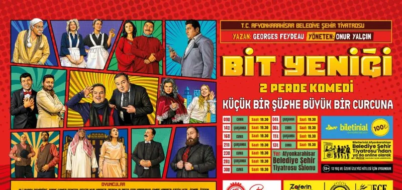 Afyonkarahisar Belediyesi Şehir Tiyatrosu, yeni sezonunu Georges Feydeau'nun "Bit Yeniği" adlı komedi oyunuyla açmaya hazırlanıyor. Fransız vodvil tiyatrosunun önemli ismi Feydeau tarafından 1907'de yazılan eser, yanlış anlamalar üzerine kurulu kurgusu ve temposuyla dikkat çekiyor.