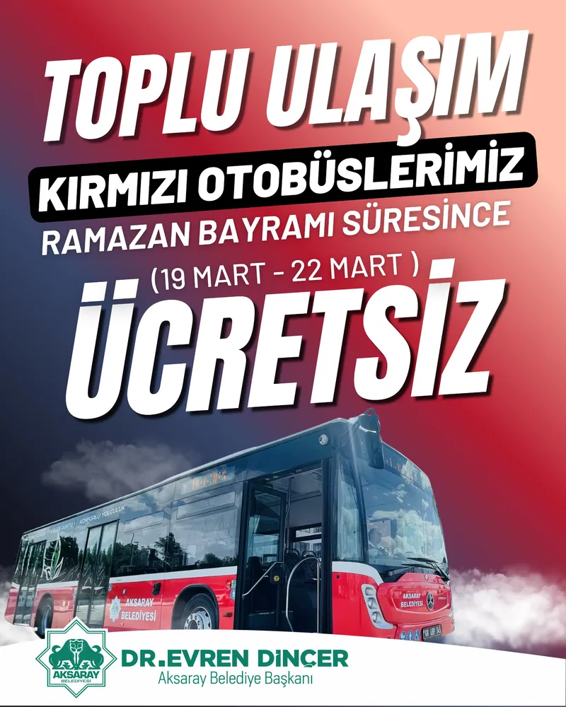 Aksaray Belediyesi, Ramazan Bayramı süresince kırmızı otobüslerde ücretsiz ulaşım hizmeti başlatacak. Uygulama, vatandaşların bayram ziyaretlerini kolaylaştırmayı amaçlıyor.