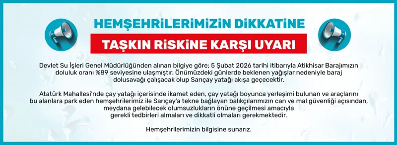 Atikhisar Barajı'nın doluluk oranı %89'a ulaştı. Beklenen yağışlar nedeniyle baraj dolusavağının çalıştırılacağı ve Sarıçay yatağının akışa geçeceği bildirildi. Yetkililer, bölgede ikamet eden ve araçlarını park eden vatandaşlar i