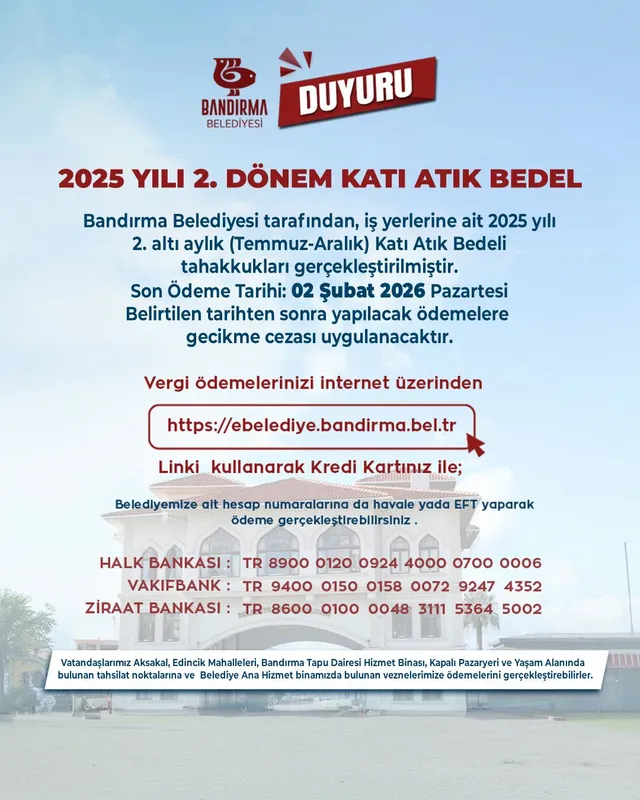 Bandırma Belediyesi, iş yerleri için 2025 yılının ikinci altı aylık dönemine ait katı atık bedeli tahakkuklarını gerçekleştirdi. Son ödeme tarihi 2 Şubat 2026 olarak belirlendi.