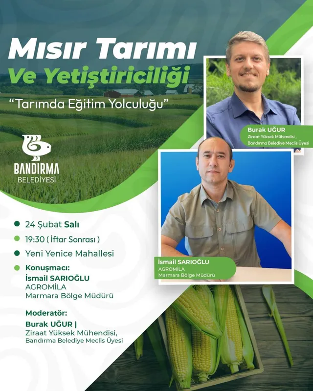 Bandırma Belediyesi, üreticileri desteklemek amacıyla 'Mısır Tarımı ve Yetiştiriciliği' konulu bir eğitim programı organize ediyor. Eğitim, 24 Şubat Salı günü Yeni Yenice Mahallesi'nde iftar sonrası gerçekleştirilecek.