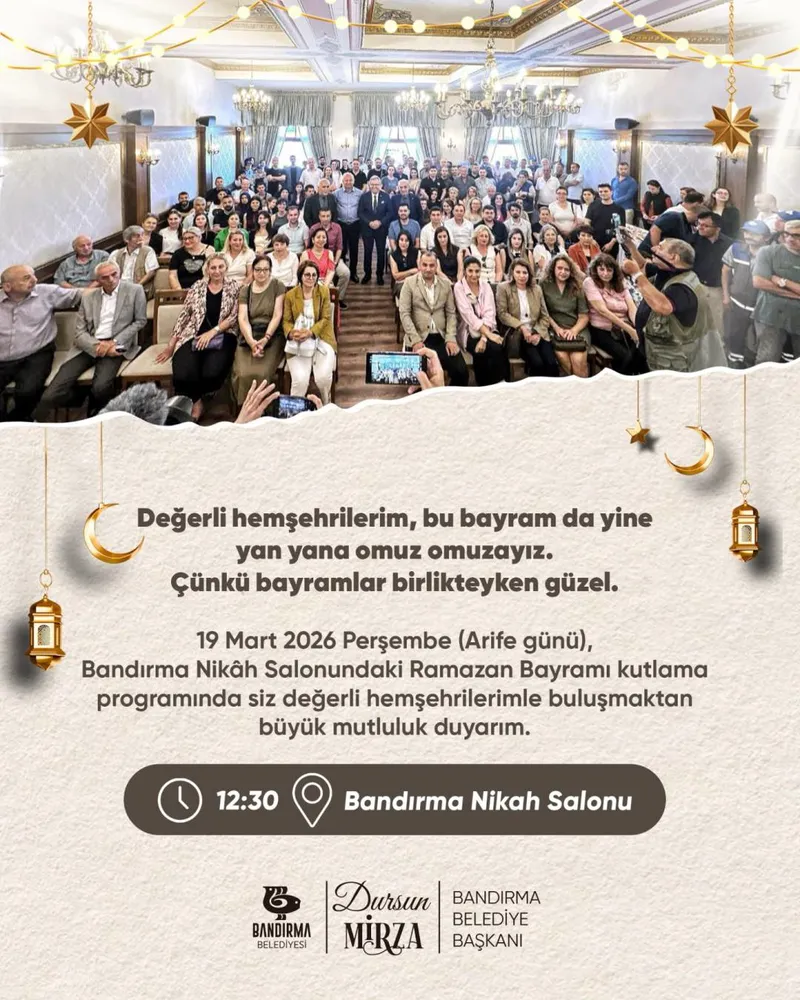 Bandırma Belediyesi, Arife Günü'nde tüm hemşehrilerini Nikâh Salonu'nda gerçekleştirilecek bayramlaşma programına davet ediyor.