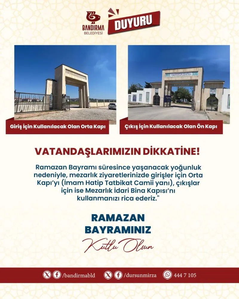 Bandırma Belediyesi, bayram süresince mezarlık ziyaretlerinde yaşanabilecek yoğunluğu önlemek amacıyla giriş ve çıkış noktalarını belirledi.