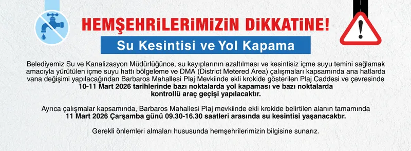 Çalışmalar nedeniyle, Barbaros Mahallesi Plaj mevkiinde belirtilen alanın tamamında 11 Mart 2026 Çarşamba günü 09.30-16.30 saatleri arasında su kesintisi yaşanacak. İlgili kurum, vatandaşların gerekli önlemleri almalarını istedi.
