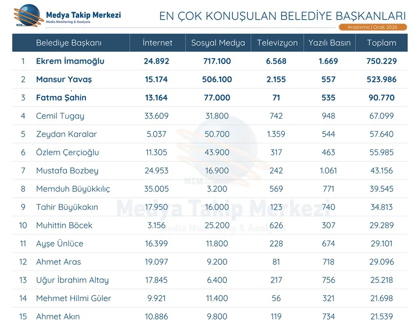 MTM Medya Takip Merkezi, medya ve sosyal medya mecralarında en çok konuşulan belediye başkanlarını araştırdı. Konuşulma hacminin %25 arttığı Ocak 2026’da Ekrem İmamoğlu’nun birinci olduğu listede Mansur Yavaş ikinci, Fatma Şahin ise üçüncü sıraya yerleşti.