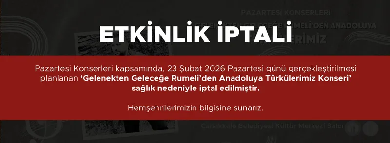 Pazartesi Konserleri kapsamında, 23 Şubat 2026 Pazartesi günü gerçekleştirilmesi planlanan ‘Gelenekten Geleceğe Rumeli’den Anadolu'ya Türkülerimiz Konseri’ sağlık nedeniyle iptal edilmiştir.