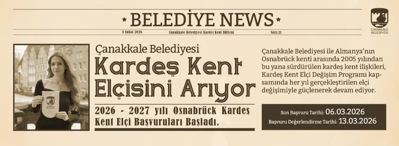 Çanakkale Belediyesi, Almanya'nın Osnabrück kentinde 2026-2027 döneminde görev yapacak Kardeş Kent Elçisi için başvuruları başlattı. Son başvuru tarihi 6 Mart 2026 olarak belirlendi.
