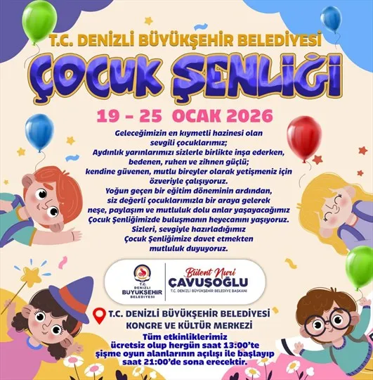 Denizli Büyükşehir Belediyesi, 19 Ocak-1 Şubat 2026 tarihleri arasında merkez ve ilçelerde bilim, sanat ve eğlenceyi bir araya getiren bir Çocuk Şenliği programı başlatıyor.
