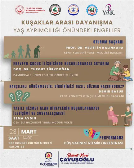 Denizli Büyükşehir Belediyesi Kent Konseyi Yaşlı Meclisi, her yıl 18-24 Mart tarihleri arasında kutlanan Yaşlılara Saygı Haftası'nı hafta boyu sürecek programlarla kutlamaya hazırlanıyor. Etkinliklerin açılışı, 23 Mart Pazartesi günü saat 14.00'te DBB Kongre Kültür Merkezi S2 Salonu'nda yapılacak. Kent Konseyi Yaşlı Meclisi Başkanı Prof. Dr. Velittin Kalınkara'nın oturum başkanlığını üstleneceği "Kuşaklar Arası Dayanışma ve Yaş Ayrımcılığı Önündeki Engeller" konulu panelde; ebeveyn-çocuk ilişkisi ve yaşlıların sosyalleşme süreçleri ele alınacak. Bilimsel verilerin ışığındaki bu oturuma, Düş Sahnesi Ritmik Orkestrası da özel bir müzikal performansla katkı sağlayacak.