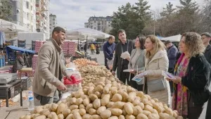Diyarbakır Büyükşehir Belediyesi Eşbaşkanı Serra Bucak, Aram Tigran Caddesi'ndeki semt pazarında esnafa Kurmancca ve Zazaca meyve-sebze etiketleri dağıttı.