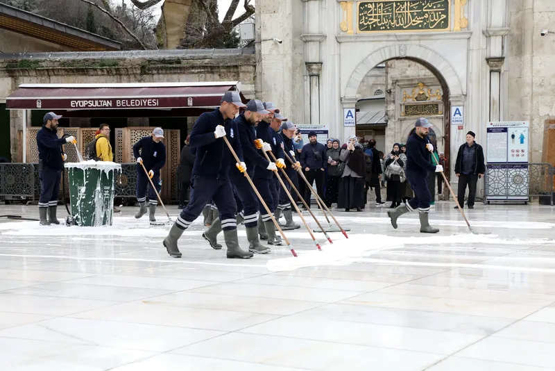 \n\nRamazan ayının önemli ziyaret noktalarından Eyüp Sultan Camii'nde detaylı bir temizlik çalışması yapıldı. Cami içi, minber, mihrap, camlar, ayakkabılıklar ve kapılar silinerek baştan aşağı temizlendi. Aydınlatma sistemleri ve avizeler de temizlenip bakımdan geçirildi.