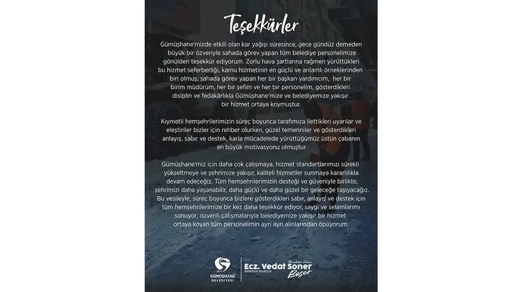 Gümüşhane Belediye Başkanı, kentte etkili olan kar yağışı süresince görev yapan tüm belediye personeline teşekkür etti.