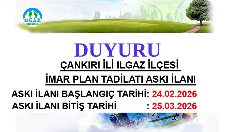 Çankırı'nın Ilgaz ilçesinde belirli bir alanda yapılacak imar plan değişikliği için askı süreci başladı. İlan, 24 Şubat 2026'da başlayıp 25 Mart 2026'da sona erecek.