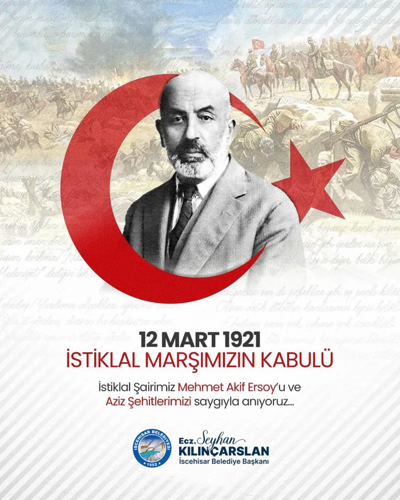 İscehisar Belediye Başkanı Seyhan Kılınçarslan, 12 Mart İstiklal Marşı'nın Kabulü ve Mehmet Akif Ersoy'u Anma Günü nedeniyle bir mesaj yayınladı.