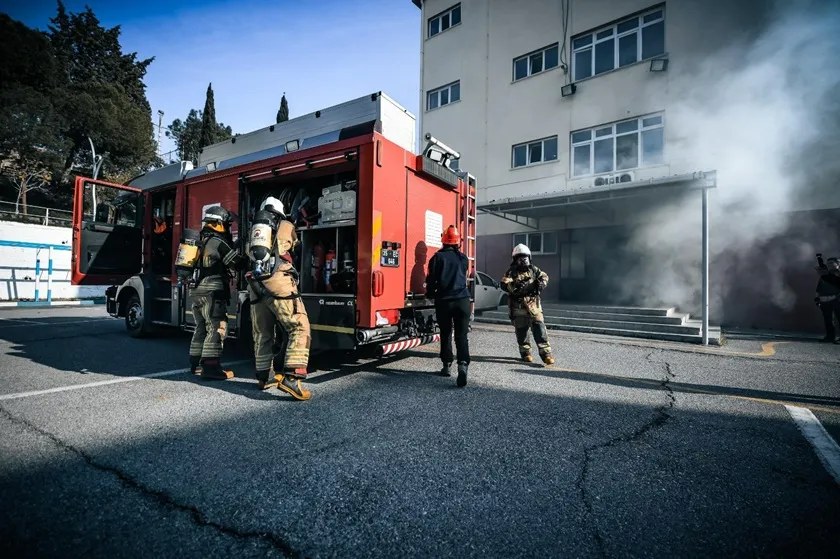 İzmir Büyükşehir Belediyesi İtfaiye Dairesi Başkanlığı ekipleri tarafından Buca’da bulunan Rüştü Ünsal Polis Meslek Yüksekokulu’nda yangın tatbikatı gerçekleştirildi. Tatbikat senaryosuna göre, 4 katlı binanın zemin katında yer alan bir derslikte elektrik hatlarından kaynaklanan bir yangın çıktı. Dumanların hızla binayı sarması üzerine vakit kaybetmeden 112 Acil Çağrı Merkezi’ne haber verildi. İhbar üzerine kısa sürede olay yerine ulaşan itfaiye ekipleri, yangına hızla müdahale ederek alevleri kontrol altına almayı başardı.