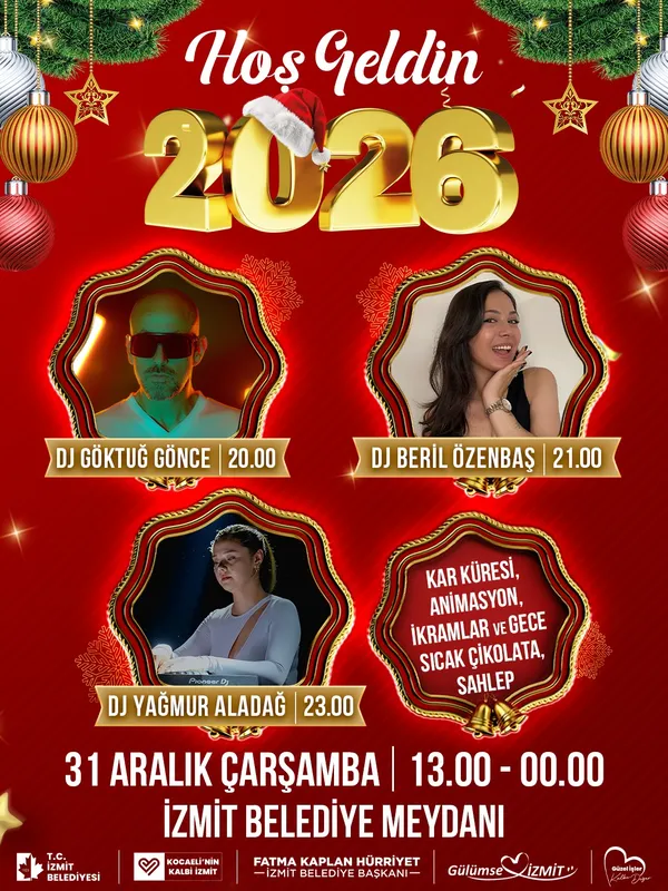 Yılbaşı gecesi 20.00'de DJ Göktuğ Gönce, 21.00'da DJ Beril Özenbaş, 23.00'da ise DJ Yağmur Aladağ sahne alacak. Müzik, eğlence ve birlik duygusunun ön planda olacağı İzmit Belediyesi yılbaşı programı, 2026'ya neşeyle girmek isteyen herkes için kaçırılmayacak bir buluşma olacak.