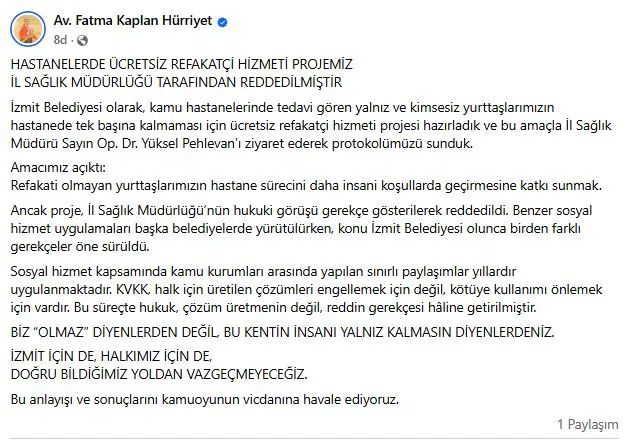 İzmit Belediye Başkanı Fatma Kaplan Hürriyet, İl Sağlık Müdürlüğü'nün hastanelerde ücretsiz refakatçi hizmeti projesini reddettiğini açıkladı. Hürriyet, "İzmit için de, halkımız için de, doğru bildiğimiz yoldan vazgeçmeyeceğiz. Bu anlayışı ve sonuçlarını kamuoyunun vicdanına havale ediyoruz" ifadelerini kullandı.