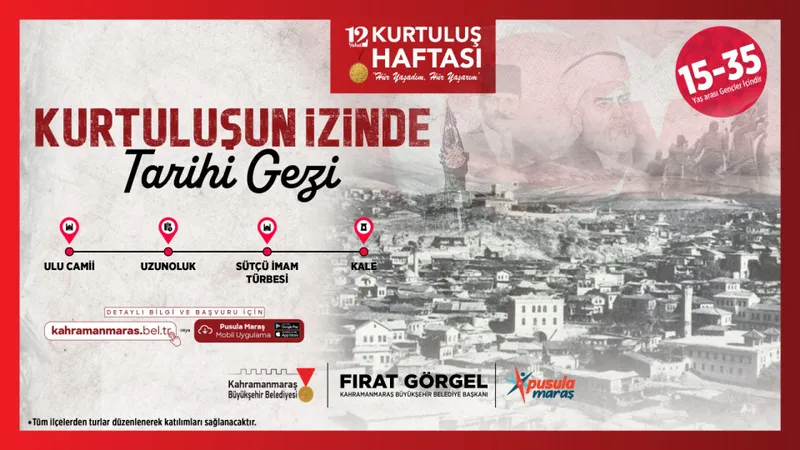 Kahramanmaraş Büyükşehir Belediyesi, 12 Şubat Kurtuluş Haftası’nda gençlere yönelik “Kurtuluşun İzinde” temalı tarihi gezi programı düzenleyecek. Geziye başvurular belediyenin internet adresinden çevrimiçi yapılabiliyor.