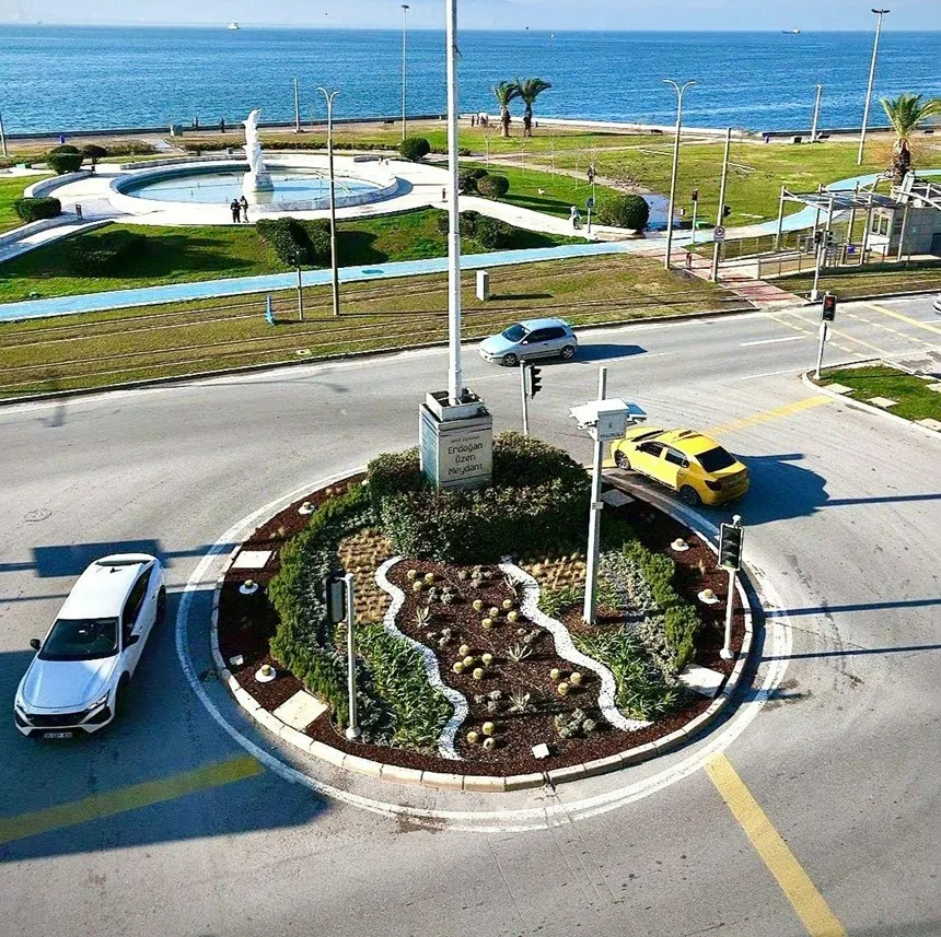 İzmir Büyükşehir Belediyesi, kavşak ve refüjler başta olmak üzere kamusal alanları özgün ve sürdürülebilir peyzaj tasarımlarıyla yeniliyor. Trafik güvenliği gözetilerek hazırlanan düzenlemeler, su tasarrufu sağlayan bitki seçimleriyle kente uzun ömürlü ve estetik bir görünüm kazandırıyor.