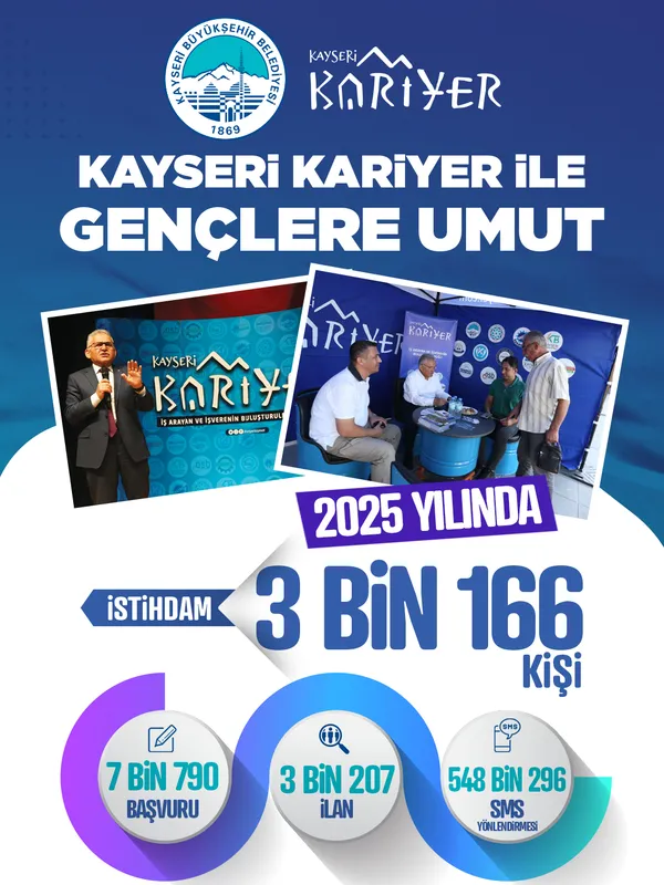 Kentteki üniversite ve meslek odaları gibi kuruluşlarla iş birliği yaparak istihdama aracılık eden Kayseri Kariyer Merkezi, 2025 yılında 3 binden fazla vatandaşın iş bulmasına yardımcı oldu.