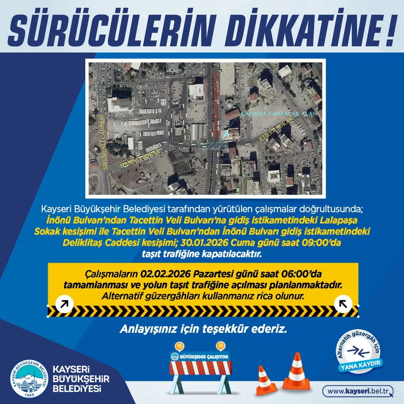 İnönü Bulvarı’ndan Tacettin Veli Bulvarı’na gidiş istikametindeki Lalapaşa Sokak kesişimi ile Tacettin Veli Bulvarı’ndan İnönü Bulvarı’na gidiş istikametindeki Deliklitaş Caddesi kesişimi, 30 Ocak 2026 Cuma günü saat 09:00 itibarıyla taşıt trafiğine kapatılacak.