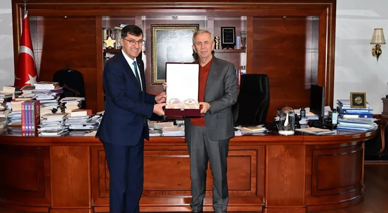 Kütahya Belediye Başkanı Eyüp Kahveci ve beraberindeki heyet, Ankara Büyükşehir Belediye Başkanı Mansur Yavaş'ı makamında ziyaret etti.