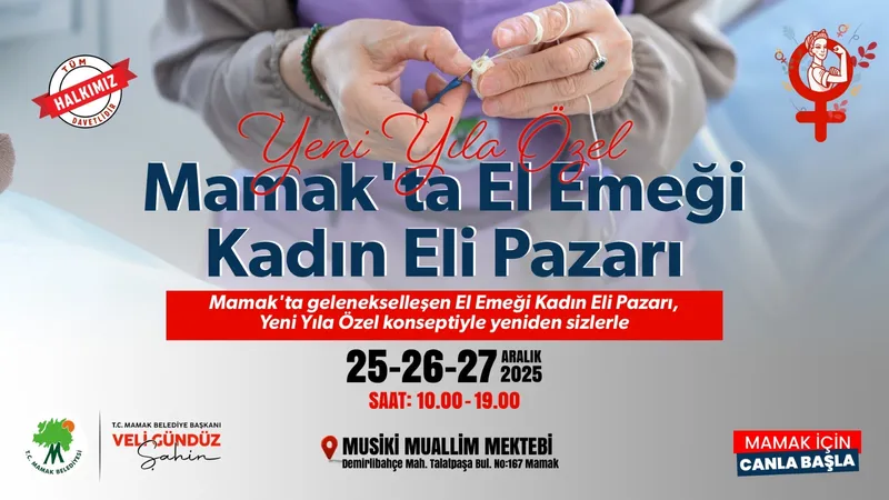 Mamak Belediyesi, kadın girişimcilerin el emeği ürünlerini satışa sunacağı 'El Emeği Kadın Eli Pazarı'nı yeni yıl konseptiyle Musiki Muallim Mektebi'nde açıyor. Pazar, 25-27 Aralık tarihleri arasında ziyaret edilebilecek.