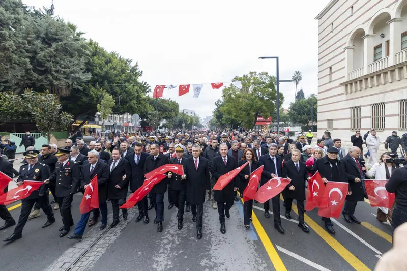 Karşılamanın ardından protokol üyeleri, temsili heyet, vatandaşlar ve öğrenciler, Mersin Büyükşehir Belediye Bandosu eşliğinde Cumhuriyet Alanı'na yürüdü. Vatandaşlar, korteji evlerinin balkonlarından ve pencerelerinden selamlayarak kutlama coşkusuna ortak oldu.