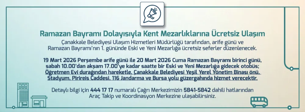 Çanakkale Belediyesi, arife günü ve bayramın birinci gününde Eski ve Yeni Mezarlık'a saatlik seferlerle ücretsiz ulaşım sağlayacak. Servisler, belirlenen güzergâhta 10.00-17.00 saatleri arasında hizmet verecek.