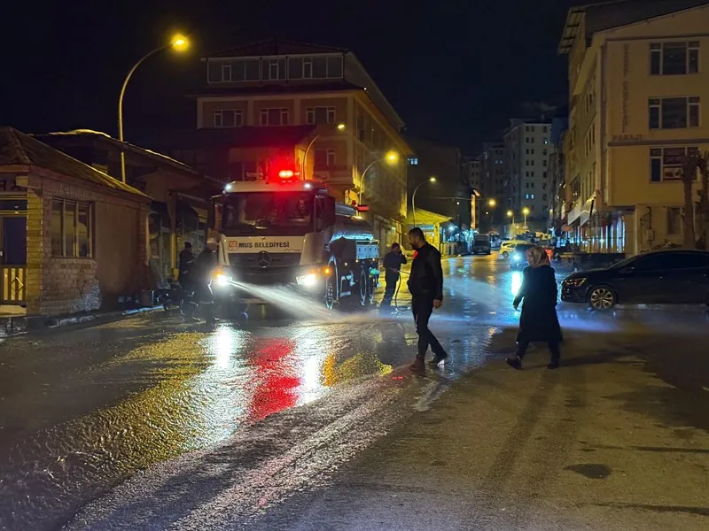 Muş Belediyesi Temizlik İşleri Müdürlüğü ekipleri, İstasyon Caddesi'nde biriken çamur ve atıkları gece yapılan tazyikli su çalışmasıyla temizledi.