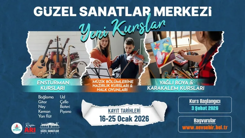 Sınırlı kontenjanla açılacak kurslara katılmak isteyenler, 16 - 25 Ocak 2026 tarihleri arasında Nevşehir Belediyesi web sitesinin Hızlı Menü bölümündeki 'Güzel Sanatlar Merkezi Kurs Başvuruları' sekmesinden online kayıt yaptırabilecek.
