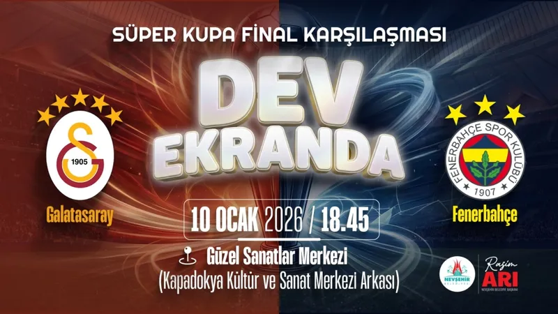 Nevşehir Belediyesi, Süper Kupa final müsabakasını halkla birlikte izlemek için dev ekran kurma kararı aldı. Galatasaray ile Fenerbahçe arasında oynanacak final karşılaşması, Kapadokya Kültür ve Sanat Merkezi arkasındaki Güzel Sanatlar Merkezi önüne kurulacak dev ekrandan canlı olarak yayınlanacak. Bu organizasyonla, Nevşehirli sporseverlerin maç coşkusunu birlikte yaşaması hedefleniyor.