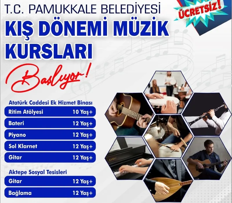 Pamukkale Belediyesi, kültür ve sanat alanındaki ücretsiz kurslarına yenilerini ekledi. Yeni dönem müzik kursları için başvurular başladı. Her yaştan katılımcıya açık olan kurslar, ilçedeki sanat yaşamını güçlendirmeyi ve sanatı herkes için erişilebilir kılmayı amaçlıyor.