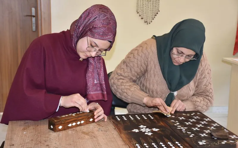 Sedefkarlık olarak nitelendirilen sedef kakma sanatı kapsamında kadın kursiyerler, kılıç, kama, sandık, ayna ve rahle gibi birçok ürüne sedef işliyor. Geleneksel olarak erkeklerin yaptığı bu sanat dalında kadınların ürettiği ürünler dikkat çekiyor. Üretilen eşyalar, çeşitli hediyelik eşya galerilerinde satışa sunuluyor. Usta öğreticiler tarafından verilen eğitimlerde, midye ve istiridye gibi deniz hayvanlarının kabuğundaki sert ve beyaz madde işleniyor. Kadınlar, bu malzemeyi ceviz ağacından yapılan ürünlere kakarak sanatlarını icra ediyor.