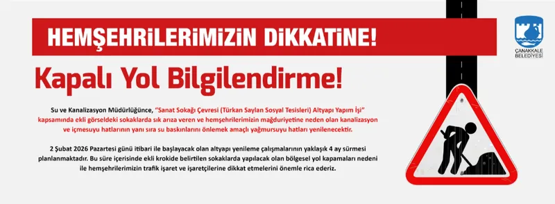 Çanakkale Belediyesi Su ve Kanalizasyon Müdürlüğü, Sanat Sokağı çevresinde kanalizasyon, içmesuyu ve yağmursuyu hatlarını yenileyecek. Çalışmalar 2 Şubat 2026'da başlayacak ve yaklaşık 4 ay sürecek.