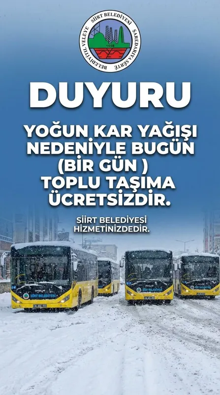 Oluşan olumsuz hava koşullarının ulaşım üzerindeki etkilerini azaltmak ve trafik güvenliğini artırmak amacıyla, Siirt genelindeki toplu taşıma hizmetleri bir gün süreyle ücretsiz olarak sunulacak.