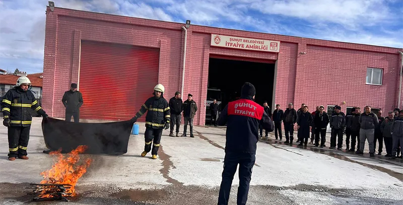 Şuhut Belediyesi personeline yönelik iş sağlığı ve güvenliği kapsamında yangın eğitimi ve tatbikat programı düzenlendi. Uygulamalı olarak gerçekleştirilen eğitimde, olası yangın durumlarına karşı doğru müdahale yöntemleri anlatıldı.