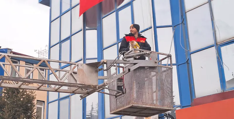 Şuhut Belediyesi İtfaiye Müdürlüğü ekipleri, bir iş merkezinin dış cephesinde mahsur kalan kediyi başarılı bir operasyonla kurtardı.
