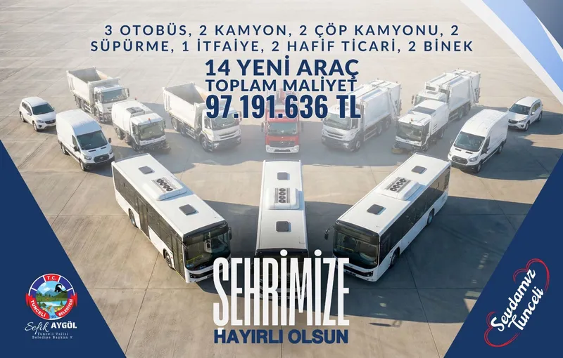 Tunceli Belediyesi, araç filosunu güçlendirmek amacıyla toplam 97.191.636 TL maliyetle 14 yeni araç temin etti. Toplamda 3 otobüs, 2 kamyon, 2 çöp kamyonu, 2 süpürme aracı, 28 metre merdivenli 1 itfaiye aracı, 2 hafif ticari araç ve 2 binek araç hizmete alındı.