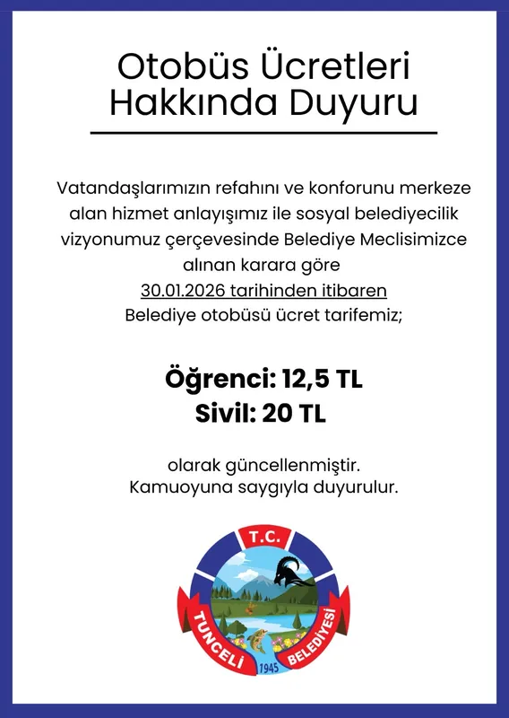 Tunceli Belediyesi, 30 Ocak 2026 tarihinden itibaren geçerli olmak üzere toplu taşıma ücret tarifesini güncelledi. Öğrenci ücreti 12,5 TL, tam bilet ücreti ise 20 TL olarak belirlendi.