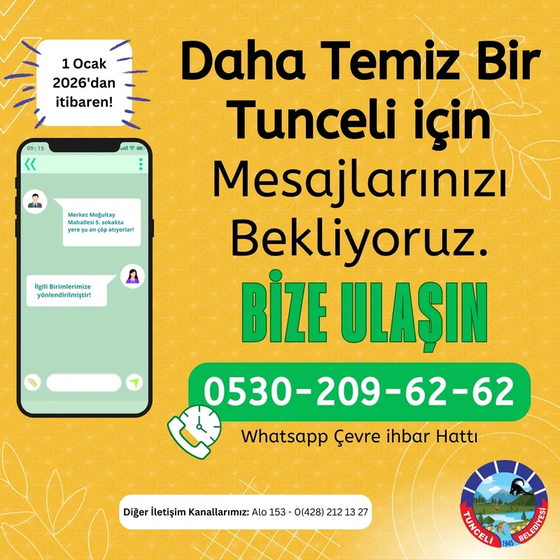 Tunceli Belediyesi, çevrenin korunması ve kent düzeninin sağlanmasına katkı sunmak amacıyla WhatsApp Çevre İhbar Hattı'nı 1 Ocak 2026 tarihi itibarıyla hizmete alacak.