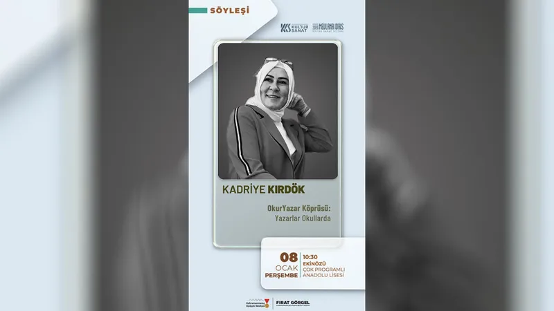Kahramanmaraş Büyükşehir Belediyesinin 'Yazarlar Okullarda' programı kapsamında yazar Kadriye Kırdök, 8 Ocak Perşembe günü Ekinözü Çok Programlı Anadolu Lisesi'nde öğrencilerle buluşacak.