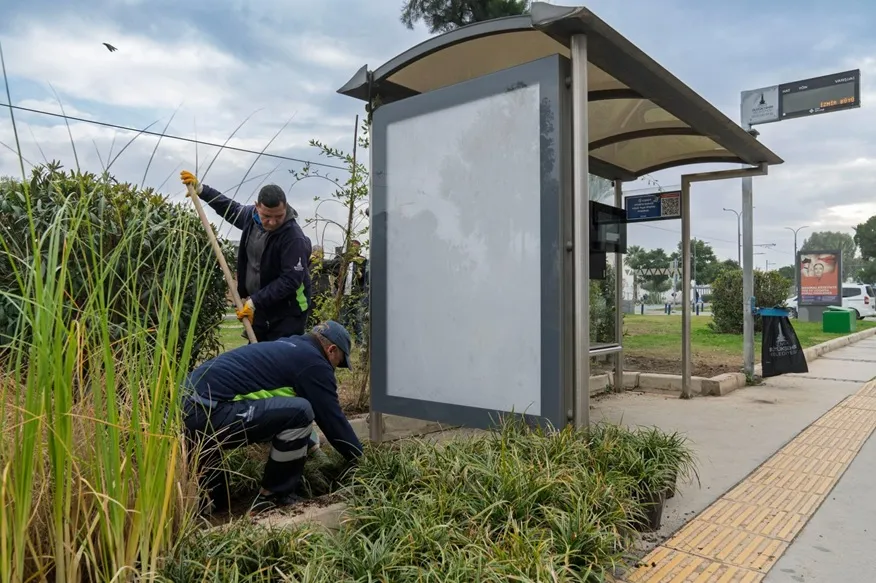 İzmir Büyükşehir Belediyesi, kamusal alanlarda yaptığı estetik dokunuşlarla kentin çehresini değiştirmeye otobüs duraklarıyla devam ediyor. Yeşil Durak projesi kapsamında durakların üstü sarmaşıklarla donatılırken, durak çevresi ise az su tüketen bitkilerle düzenleniyor.