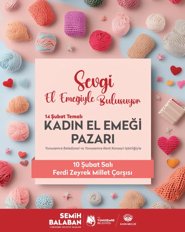 Yunusemre Belediyesi ve Yunusemre Kent Konseyi işbirliğiyle, Ferdi Zeyrek Millet Çarşısı'nda faaliyet gösteren Kadın El Emeği Pazarı'nda 10 Şubat Salı günü özel bir etkinlik gerçekleştirilecek. Pazar, bu hafta 14 Şubat Sevgililer Günü temasıyla düzenlenecek.