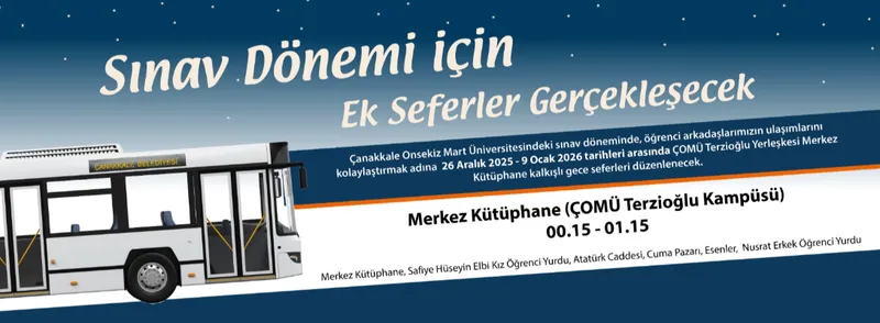 Çanakkale Onsekiz Mart Üniversitesi öğrencilerinin sınav dönemi ulaşımını kolaylaştırmak için Terzioğlu Yerleşkesi'nden gece seferleri düzenlenecek. Seferler 26 Aralık 2025 ile 9 Ocak 2026 tarihleri arasında gece yarısından sonra