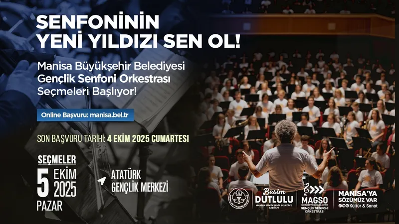 Manisa Büyükşehir Belediyesi, sanatın genç temsilcilerini bir araya getiren Manisa Büyükşehir Belediyesi Gençlik Senfoni Orkestrası (MAGSO) için başvuru süreci devam ediyor. Son başvuru tarihi 4 Ekim Cumartesi, seçmeler ise 5 Ekim Pazar günü yapılacak.