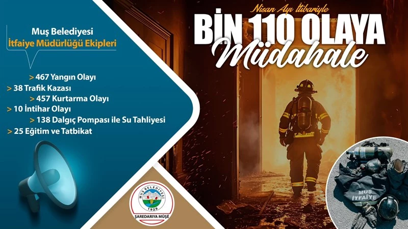 Muş Belediyesi İtfaiye ekipleri Nisan ayı itibariyle 9 ayda Bin 110 olaya müdahale etti.