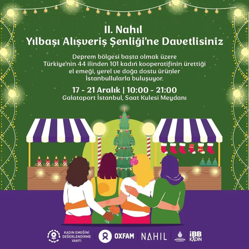 İBB Kadın ve Kadın Emeğini Değerlendirme Vakfı (Oxfam KEDV) iş birliğiyle düzenlenen Nahıl Yılbaşı Alışveriş Şenliği, bu yıl da Türkiye’nin dört bir yanından kadın kooperatiflerini İstanbullularla buluşturuyor. Deprem bölgesi başta olmak üzere 44 ilden 101 kadın kooperatifinin el emeği ürünleri, 17 – 21 Aralık tarihlerinde Galataport İstanbul Saat Kulesi Meydanı’nda ziyaretçilerin beğenisine sunulacak.